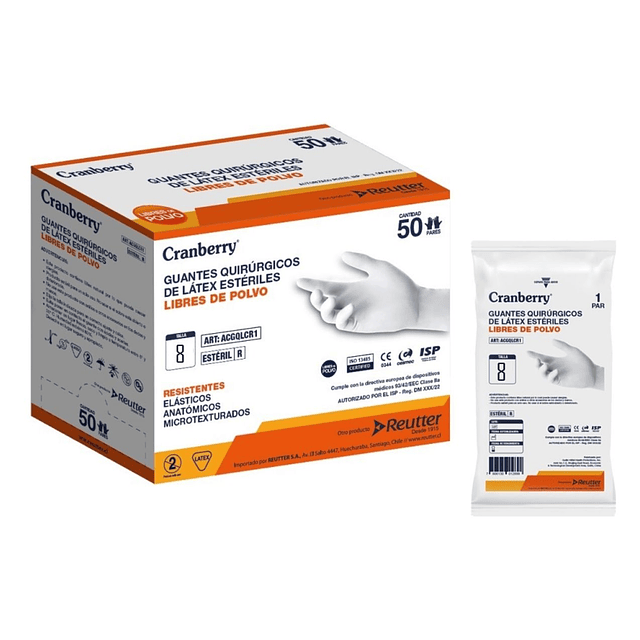 - Su uso se extiende al área médica, dental, veterinaria, estética y cosmética.- Los guantes quirúrgicos de látex estéril sin polvo son una excelente barrera física, brindan un calce seguro, cómodo y flexible durante horas en pabellón y/o en cualquier otro procedimiento que se requiera técnica estéril.- Este dispositivo médico no posee polvo, disminuyendo la sensibilidad y posibilidad de provocar alergias al látex. El polvo en los guantes actúa como transportador de la proteína del látex hacia la piel y/o vías respiratorias del usuario, provocando sensibilidad y alergias.Su uso se extiende al área médica, dental, veterinaria, estética y cosmética.Contenido de la compra :1x Caja de 50 pares