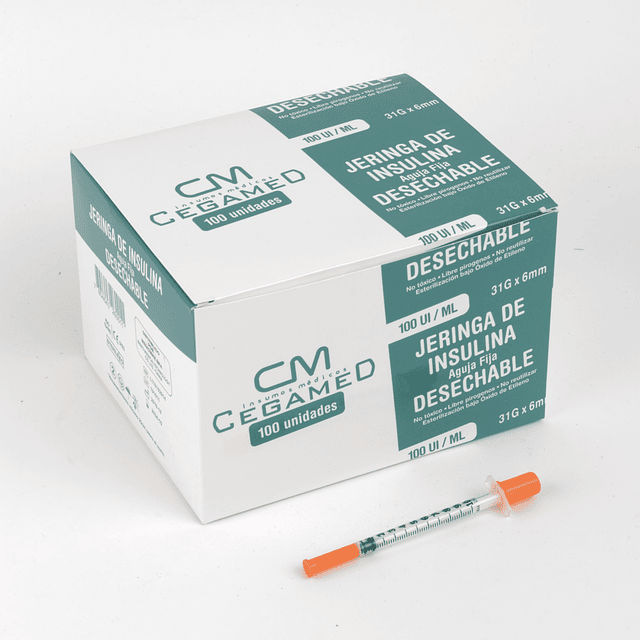 Jeringa para insulina 31G x 6mm - 1ml/100UI con aguja fija.Uso:Para administrar insulina de forma subcutánea CARACTERÍSTICASJeringa y agujas desechables, diseñadas para un solo uso.Cuenta con tapa de seguridad en aguja y en embolo.Presentación en caja de 100 unidades.